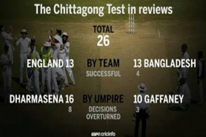 ডেস্ক রিপোর্টার: ডিসিশন রিভিউ সিস্টেম (ডিআরএস)আইনটি রেকর্ড গড়লো চট্টগ্রামে বাংলাদেশ-ইংল্যান্ড টেস্টে। চট্টগ্রাম টেস্টে রেকর্ড মোট ২৬বার অন-ফিল্ড রিভিউ নিয়েছে দু’দল। টেস্ট ক্রিকেটের কোন ম্যাচে এত অন-ফিল্ড রিভিউ আগে কখনো ঘটেনি। টেস্টের প্রথম ইনিংসেই ইংল্যান্ডের ব্যাটিং-এর সময় মোট দশবার রিভিউ নেয়া হয়। এটিও রেকর্ডের পাতায় জায়গা করে নেয়। এরপর বাংলাদেশ ইনিংসে নেয়া হয় ৫টি রিভিউ।