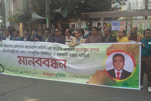 ডেস্ক রিপোর্ট : বাংলাদেশ প্রতিদিনের সাভার প্রতিনিধি নাজমুল হুদার নিঃশর্ত মুক্তি এবং তার বিরুদ্ধে নির্যাতনমূলক মামলার দায়ে তিন পুলিশ কর্মকর্তাকে অবিলম্বে প্রত্যাহার দাবিতে ঢাকাসহ সারা দেশের বিভাগীয় ও জেলা শহরে আজ শনিবার বিক্ষোভ ও মানববন্ধন কর্মসূচি চলছে। কর্মসূচিতে সারা দেশে সাংবাদিকদের ওপর হয়রানি ও নির্যাতনের প্রতিবাদ জানানো হয়।