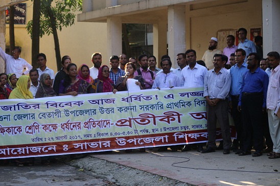 বরগুনা বেতাগী উপজেলার উত্তর করুনা সরকারী প্রাথমিক বিদ্যালয়ের স্বামীকে বেধে সহকারী শিক্ষিকাকে ক্লাস রুমে গণধর্ষনের ঘটনায় জড়িত ব্যক্তিদের ও ভুয়া রির্পোট প্রদান কারী ডাক্তারকে গ্রেফতার পূর্বক সুষ্ঠ বিচারের দাবীতে সম্প্রতি ঢাকার সাভারে প্রতিকী অনশন পালিত হয় । এ প্রতিকী কর্মসূচী আয়োজন করেন সাভারের সর্বত্রের প্রাথমিক বিদ্যালয়ের শিক্ষক শিক্ষিকারা। উপজেলা চত্ররে বিকাল সাড়ে ৪টা থেকে সাড়ে ৫ টা পর্যন্ত ১ ঘন্টা ব্যাপী এ কর্মসূচী পালন কালে প্রতিকী প্রতিবাদ সভায় বক্তব্য রাখেন সাভার উপজেলা শিক্ষা কর্মকর্তা তাফসিরা ইসলাম লিজা, এটিও সৈয়দা পারভীন,বাংলাদেশ সরকারী প্রাথমিক বিদ্যালয়ের প্রধান শিক্ষিক সমিতি সাধারন সম্পাদ নজরুল ইসলাম,সাভার উপজেলা শিক্ষক সমিতির সভাপতি আলাল উাদ্দন আলাল,সাধারন সম্পাদক শফিকুল ইসলাম পাটোয়ারী,প্রধান শিক্ষক আব্দুল আলী.গাজী শাহনা ইসলাম, ওয়াজেদ মন্ডল,গবিন্দ্র রাজ বংশী প্রমূখ। শেষে সাভার উপজেলা নিবার্হী অফিসারসহ সংশ্লিষ্ট কর্মকর্তাদের কাছে পৃথক স্বারক লিপি প্রদান করা হয়।