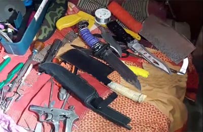 ‘কক্ষের চৌকির ওপর থেকে উদ্ধার করা হয়েছে চারটি পিস্তল, সাতটি গুলি, চারটি ম্যাগাজিন, আটটি উন্নত চাকু, চারটি হাতুড়ি, একটি চায়নিজ কুড়াল, তিনটি প্লাস, দুটি ড্রিল মেশিন, কাটার, শাইন, একটি বাইশ এবং অস্ত্র তৈরির বিপুল সরঞ্জাম। অভিযান টের পেয়ে বাড়ি থেকে পালিয়ে যাওয়ার সময় দুজনকে আটক করা হয়। বাড়ির মালিকের ছেলে নুরুদ্দিন পালিয়ে গেছে।’