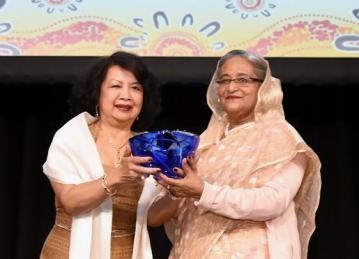 শেখ হাসিনা শুক্রবার এখানে ‘গ্লোবাল উইমেন সামিট’-এর প্রেসিডেন্ট আইরিন নাতিভিদাদ-এর কাছ থেকে মুহুর্মূমুহু করতালির মাধ্যমে এক নৈশভোজ অনুষ্ঠানে মর্যাদাপূর্ণ এ সম্মাননা গ্রহণ করেন। ইন্টারন্যাশনাল কনভেনশন সেন্টারে (আইসিসি) অনুষ্ঠিত এ অনুষ্ঠানে সভাপতিত্ব করেন গ্লোবাল সামিট অব উইমেন-এর প্রেসিডেন্ট আইরিন নাতিভিদাদ। এ সম্মেলনে বিশ্বের প্রায় দেড় হাজার নারী নেতৃত্ব যোগদান করেন।