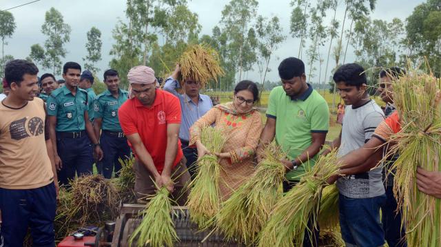 আজ শনিবার দুপুরে নগরের খটখটিয়া এলাকায় কৃষক আবদুল মজিদের খেতের ধান কেটে দিয়েছে পুলিশ।