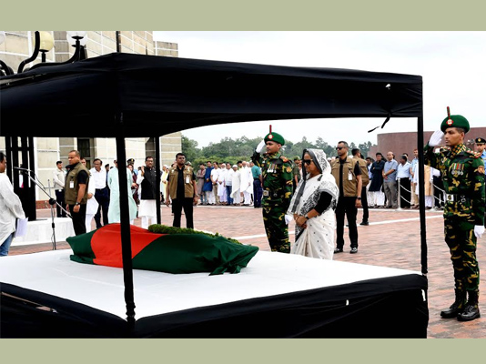 দেশ বরেণ্য এই রাজনৈতিক ব্যক্তিত্বের কফিনে ফুলেল শ্রদ্ধাঞ্জলী অর্পনের পর তাঁর স্মৃতির প্রতি সম্মান প্রদর্শনের অংশ হিসেবে সেখানে কিছুক্ষণ নীরবে দাঁড়িয়ে থাকেন প্রধানমন্ত্রী।