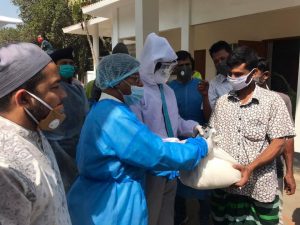বিতরণ করা ত্রাণ সামগ্রীর মধ্যে রয়েছে চাল,ডাল,তেল,আলুসহ নিত্যপ্রয়োজনীয় পণ্য।