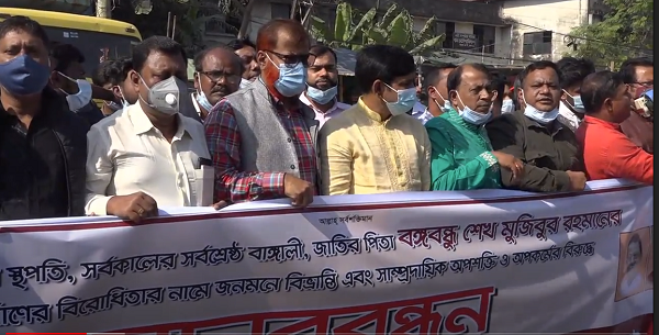 বঙ্গবন্ধুর ভাস্কর্য নিয়ে বিরোধীতা কারীদের কঠোর শাস্তির দাবিতে সাভারে মানববন্ধন