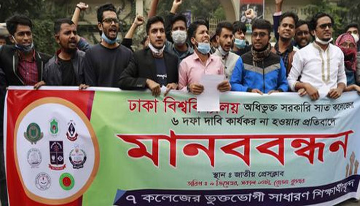 ৯ ডিসেম্বর ২০২০ (বিবিনিউজ):ঢাকা বিশ্ববিদ্যালয়ের অধিভুক্ত রাজধানীর সাত সরকারি কলেজের শিক্ষার্থীদের পরবর্তী বর্ষে প্রমোশনের নতুন নিয়ম বাতিলের দাবি জানিয়েছেন শিক্ষার্থীরা। আজ বুধবার দুপুরে ঢাকা কলেজের সামনে আয়োজিত এক মানববন্ধন থেকে প্রমোশনের এই নতুন নিয়মটি বাতিলসহ ছয় দফা দাবি জানান তারা।