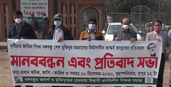 ষ্টাফ রিপোর্টার, ১০ ডিসেম্বর,২০২০(বিবিনিউজ):কুষ্টিয়ায় জাতির পিতা বঙ্গবন্ধু শেখ মুজিবুর রহমানের ভাস্কর্য ভাঙচুরের প্রতিবাদে জাহাঙ্গীরনগর বিশ্ববিদ্যালয়ে মানববন্ধন কর্মসুচী পালন করেছে শিক্ষকরা।