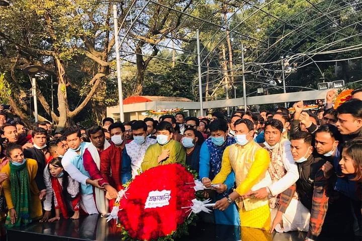 ৪ জানুয়ারি ২০২১(বিবিনিউজ):প্রতিষ্ঠাবার্ষিকী উপলক্ষে ধানমন্ডিতে জাতির জনক বঙ্গবন্ধু শেখ মুজিবুর রহমানের প্রতিকৃতিতে ফুল দিয়ে শ্রদ্ধা জানিয়েছে বাংলাদেশ ছাত্রলীগ। শ্রদ্ধা জানানোর পর সংগঠনের কেন্দ্রীয় সভাপতি আল নাহিয়ান খান বলেছেন, ‘আমাদের একটাই লক্ষ্য, অসাম্প্রদায়িক বাংলাদেশকে এগিয়ে নিয়ে যাওয়ার জন্য জননেত্রী শেখ হাসিনার হাতকে শক্তিশালী করার লক্ষ্যে কাজ করব।’