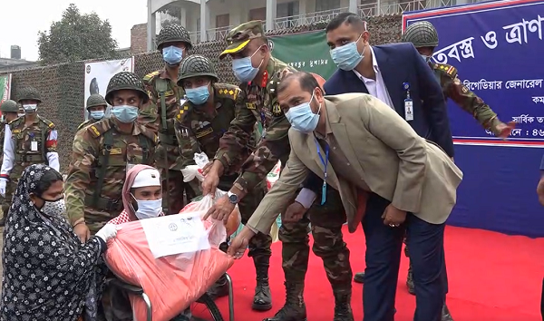 করোনা কালে স্বাস্থ্য বিধি মেনে ত্রাণ সামগ্রী ও শীত বস্ত্র বিতরণ করেন বাংলাদেশ সেনাবাহিনী।