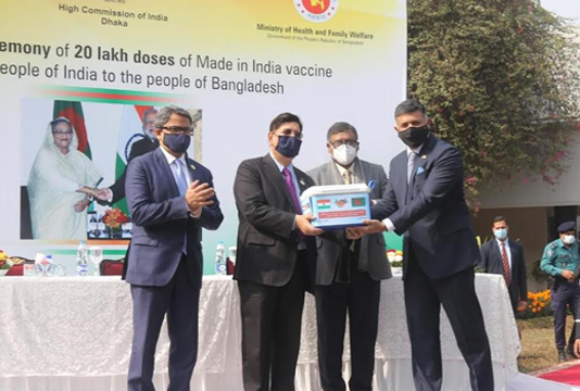 রাষ্ট্রীয় অতিথি ভবন পদ্মায় আয়োজিত এক অনুষ্ঠানে আজ ঢাকায় নিযুক্ত ভারতের হাই কমিশনার বিক্রম দোরাইস্বামী এই ভ্যাকসিনগুলি পররাষ্ট্রমন্ত্রী ড. এ. কে. আব্দুল মোমেন এবং স্বাস্থ্য ও পরিবার কল্যাণ মন্ত্রী জাহিদ মালেকের কাছে হস্তান্তর করেন।