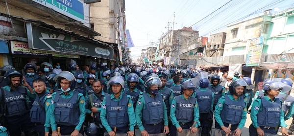 ২৭ ফেব্রুয়ারি, ২০২১ (বিবিনিউজ) : খুলনা নগরের কে ডি ঘোষ সড়কের চারপাশ ঘিরে রেখেছে শত পুলিশ। ওই সড়কেই খুলনা বিএনপির দলীয় কার্যালয় অবস্থিত। সেখানে কাউকে যেতে দেওয়া হচ্ছে না। ওই সড়কসহ আশপাশের বিভিন্ন সড়কে দুই থেকে তিনজনের সমাগম দেখলেই তাঁদের সরিয়ে দেওয়া হচ্ছে। এরই মধ্যে দলীয় কার্যালয়ের সামনে আড়াই হাজারের মতো নেতা–কর্মী জড়ো হয়েছেন।