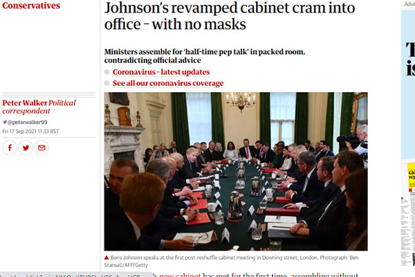 ১৮ সেপ্টেম্বর ২০২১(বিবিনিউজ ডেস্ক):যুক্তরাজ্যর প্রধানমন্ত্রী বরিস জনসনের পুনর্গঠিত মন্ত্রিসভার প্রথমবারের মতো বৈঠক অনুষ্ঠিত হয়েছে। এ সময় কোনো মাস্ক ছাড়াই সবাই গাদাগাদি করে মন্ত্রিসভার রুমে বসেন। প্রকাশিত ছবিতে দেখা গেছে কর্মকর্তা-কর্মচারীসহ কমপক্ষে ৩০ জন ওই বৈঠকে কাঁধের সঙ্গে কাঁধ মিলিয়ে বসেছেন। এ সময় রুমের জানালাও বন্ধ ছিল। খবর গার্ডিয়ানের। শুক্রবারে অনুষ্ঠিত বৈঠকে প্রধানমন্ত্রী বরিস জনসনের পাশে ছিলেন চ্যান্সেলর ঋষি সুনাক এবং মন্ত্রিপরিষদ সচিব সাইমন কেস। বিপরীত দিকে বসে ছিলেন সদ্য সাবেক পররাষ্ট্রমন্ত্রী ডমিনিক রাব। মন্ত্রিসভা পুনর্গঠনের আগে সর্বশেষ বৈঠকেও এমন ছবি দেখা গেছিল। অন্যদিকে সরকারের পক্ষ থেকে মানুষকে জনসমাগম স্থানে মাস্ক…