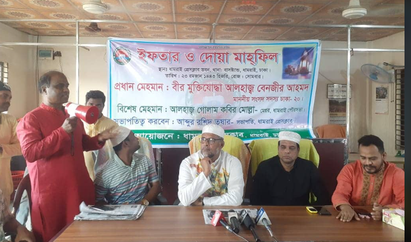 ২৬ এপ্রিল ২০২২(বিবিনিউজ ) : ঢাকার ধামরাইয়ে প্রেসক্লাবের আয়োজনে ইফতার ও দোয়া মাহফিল অনুষ্ঠিত হয়েছে। সোমবার (২৫এপ্রিল) বিকালে ধামরাই থানা বাসষ্ট্যান্ড প্রেসক্লাবে নিজ ভবনের ইফতার ও দোয়া মাহফিল অনুষ্ঠিত হয়। ধামরাই প্রেসক্লাবের সভাপতি ও বেসরকারী টিভি চ্যানেল মাই টিভির ষ্টাফ রিপোর্টার আব্দুর রশিদ তুষার এর সভাপতিত্বে প্রধান অতিথি হিসাবে উপস্থিত ছিলেন ঢাকা জেলা আওয়ামী লীগের সভাপতি ও ঢাকা-২০ ধামরাই আসনের মাননীয় সংসদ সদস্য বীরমুক্তিযোদ্ধা আলহাজ্ব বেনজির আহমদ। বিশেষ অতিথি হিসাবে উপস্থিত ছিলেন, ধামরাই পৌর আওয়ামী লীগের সভাপতি ও পৌর মেয়র আলহাজ্ব গোলাম কবির মোল্লা, ধামরাই উপজেলা আওয়ামী লীগের যুগ্ন সাধারণ…
