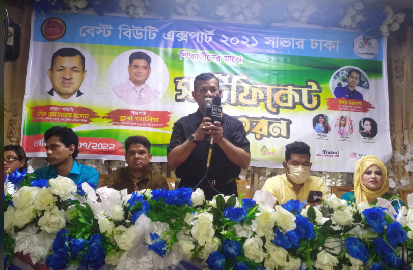 স্টাফ রিপোর্টার,২১ আগস্ট ২০২২(বিবিনিউজ): সাভারে বেস্ট বিউটি এক্সপার্ট ২০২১ সাভার অঞ্চলের প্রশিক্ষনার্থীদের প্রশিক্ষণ শেষ হয়েছে । চার দিনের প্রশিক্ষণ শেষে শনিবার দুপুরে ঢাকার সাভারের থানা রোড এলাকায় ক্যাফে মেট্রো কনভেশন সেন্টারে প্রশিক্ষনার্থীদের মাঝে সাটিফিকেট বিতরণ করেন এটিএন বাংলার চেয়ারম্যানের উপদেষ্টা ও এটিএন নিউজ এর সিইও মীর মোতাহার হাসান। এসময় দু’শতাধিক বিউটি এক্সপাট প্রশিক্ষনার্থীদের মাঝে এ সাটিফিকেট বিতরণ করা হয়। সাটিফিকেট বিতরণী অন্ষ্ঠুানে এসময় প্রধান অতিথি এটিএন বাংলার চেয়ারম্যানের উপদেষ্টা মীর মোতাহার হাসান বলেন,এটিএন বাংলা সবসময় মানুষের পাশে থাকে ভবিষতেও থাকতে দেশের মানুষের কল্যাণে এটিএন বাংলা কাজ করবেও বলে বলেন তিনি।…